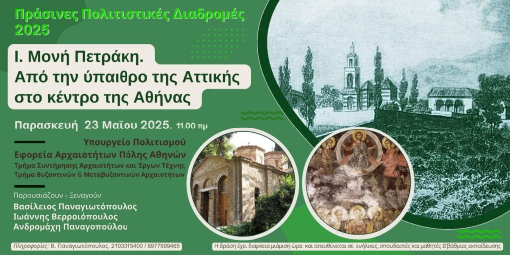 Πραγματοποιήθηκε την Παρασκευή 23 Μαΐου 2025 η εκδήλωση της Εφορείας Αρχαιοτήτων Πόλης Αθηνών, «Μονή Πετράκη. Από την ύπαιθρο της Αττικής στο κέντρο της Αθήνας», στο πλαίσιο της επικοινωνιακής δράσης, «Πράσινες Πολιτιστικές Διαδρομές» του Υπουργείου Πολιτισμού. Η εκδήλωση έλαβε χώρα στο Καθολικό της Ι. Μονής Αγίων Ασωμάτων Πετράκη, παρουσία του Αρχιεπισκόπου Αθηνών και Πάσης Ελλάδος Ιερωνύμου Β’. Υλοποιήθηκε από το Τμήμα Συντήρησης Αρχαιοτήτων & Έργων Τέχνης και το Τμήμα Βυζαντινών & Μεταβυζαντινών Αρχαιοτήτων και Μουσείων της Εφορείας Αρχαιοτήτων Πόλης Αθηνών. Περιλάμβανε ξενάγηση και παρουσίαση με ψηφιακά μέσα της ιστορικής διαδρομής της Μονής, από την φύση της Αττικής υπαίθρου κατά τα βυζαντινά χρόνια, έως τον σύγχρονο αστικό πολεοδομικό ιστό. Επίσης ανιχνεύτηκε η διασύνδεση της ιστορίας του μνημείου με εκείνη της πόλης της Αθήνας και της νεότερης Ελλάδας και η συμβολή της Μονής στην νεότερη πολεοδομική διαμόρφωση της πρωτεύουσας. Δόθηκε έμφαση στα ιστορικά στοιχεία που αντλούμε από τις πηγές που βρίσκονται επί τόπου ή προέρχονται από τον χώρο της Μονής, ενώ έγινε ιδιαίτερη αναφορά στη συμμετοχή του ζωγραφικού διακόσμου στην αποτύπωση της διαχρονίας της.