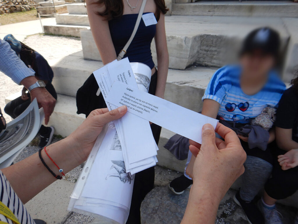 Ακολούθησε η παροχή των απαραίτητων πληροφοριών, προκειμένου οι μαθητές να κατανοήσουν τη λειτουργία των ηλιακών ρολογιών και να εξοικειωθούν με αυτή. Έτσι, έγινε χρήση χάρτινου αντιγράφου ωρολογόπλακας, βασισμένης στο ηλιακό ρολόι της νότιας πλευράς του μνημείου και διανεμήθηκε τετράπτυχο έντυπο σχεδιασμένο αποκλειστικά για το πρόγραμμα.